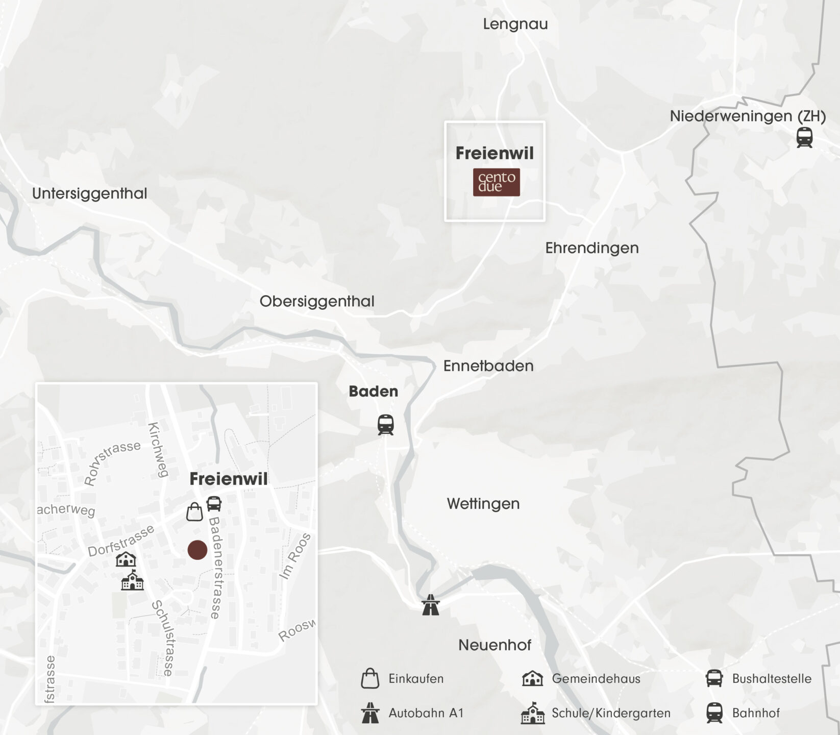 Dank der Nähe zu Baden, Wettingen und Zürich profitieren Sie von kurzen Wegen zu Arbeit, Schulen, Einkaufsmöglichkeiten und kulturellem Angebot. Mit dem Bus erreichen Sie den Bahnhof Baden in ca. 15 Minuten, von wo aus regelmässige S-Bahn- und Intercity-Verbindungen nach Zürich, Bern und Basel bestehen.